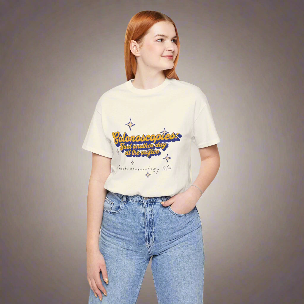 Funny Gastroenterology meme shirt. Introducing a comfortable unisex jersey short sleeve tee, ideal for casual outings or relaxed days at home. This shirt radiates a fun, lighthearted vibe, making it perfect for those who appreciate humor and enjoy brightening their day with witty statements. Tailored for adults, it makes a fantastic gift for friends or family members who work in the healthcare field, particularly gastroenterology. This tee is great for occasions like medical conferences, team-building events, or casual Fridays at work. Whether for birthdays, holidays, or just because, it's a thoughtful addition to anyone's wardrobe that sparks conversation and laughter. Product features - Side seams for a structured shape - Ribbed knit collar retains its form - Shoulder tape stabilizes and supports - Vibrant sleeve printing techniques - 100% Airlume cotton for breathable comfort Care instructions - Machine wash: cold (max 30C or 90F) - Non-chlorine: bleach as needed - Tumble dry: low heat - Iron, steam or dry: medium heat - Do not dryclean