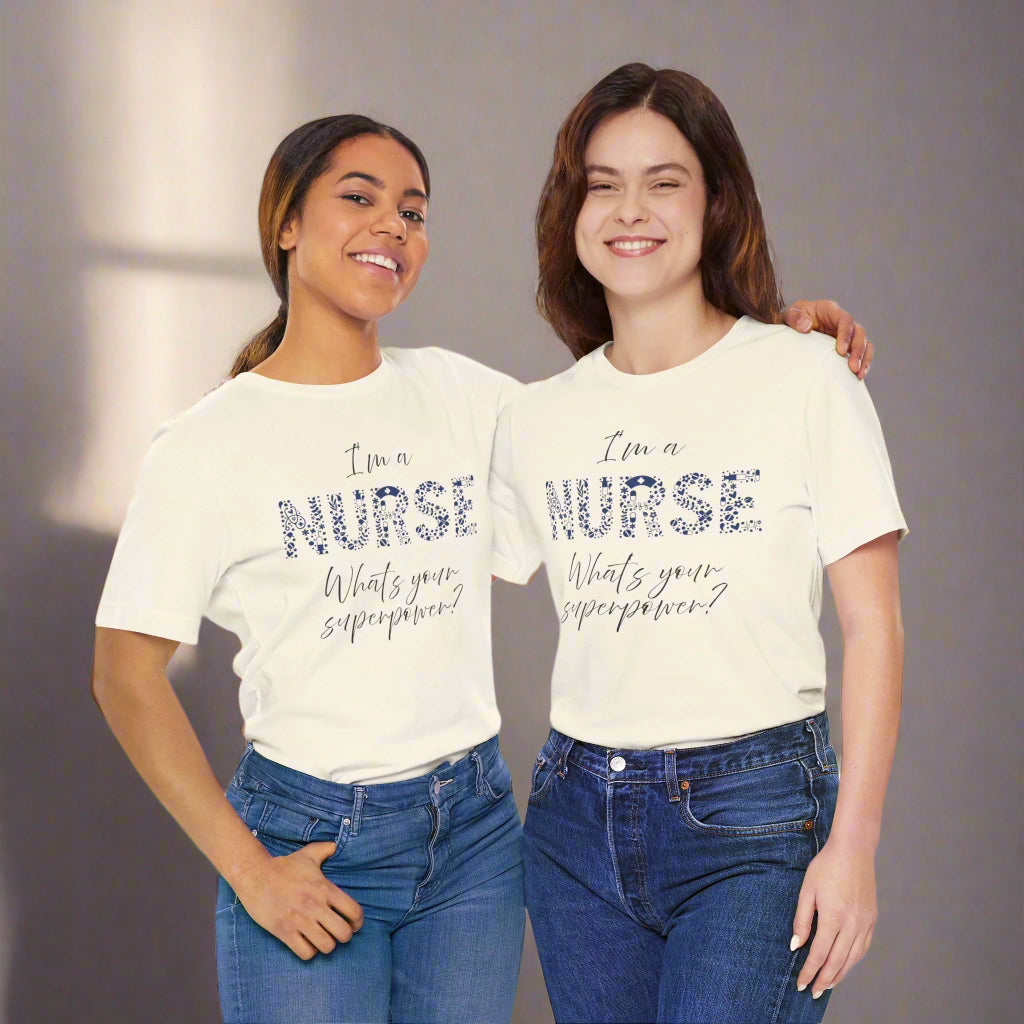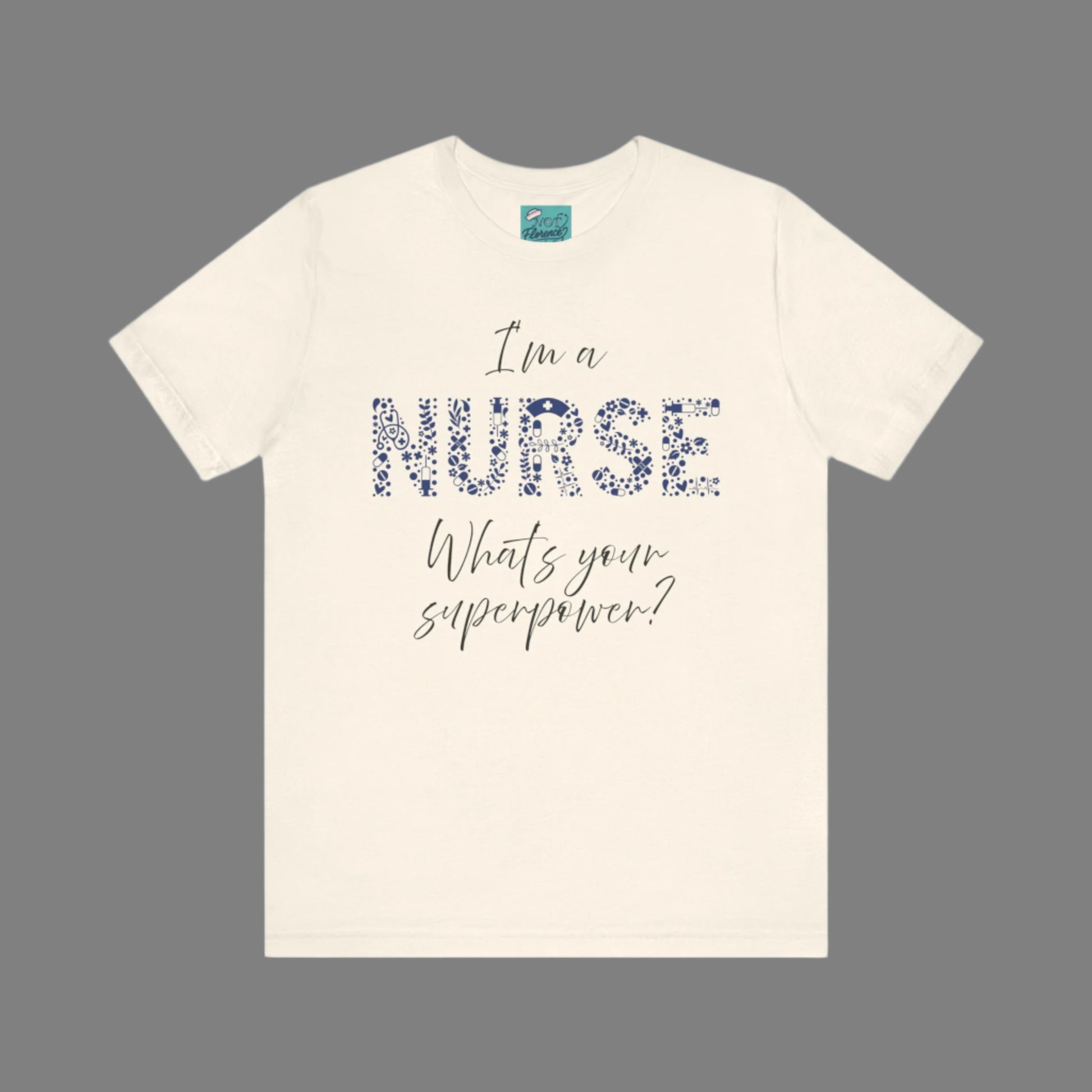 Funny nurse shirt. A unisex jersey short sleeve tee featuring the fun and empowering phrase 'I'm a nurse, what's your superpower'. This tee exudes a positive and confident vibe, making it a great addition to any nurse's wardrobe. Perfect for nurses or anyone in the medical field, this tee is ideal for showing off your profession with pride. Suitable for casual wear or as a thoughtful gift for nurses' appreciation week or graduation. Product features - Made with 100% Airlume combed and ring-spun cotton for lightweight and breathable comfort - Retail fit with a crew neckline for a classic and versatile style - Features side seams, ribbed knit collar with seam, shoulder tape for added durability - Sleeve and neck label printing techniques ensure vibrant colors and crisp designs - Compliant with REACH certification and sourced from Honduras Care instructions - Machine wash: cold (max 30C or 90F) - Non-chlorine: bleach as needed - Tumble dry: low heat - Iron, steam or dry: medium heat - Do not dry clean