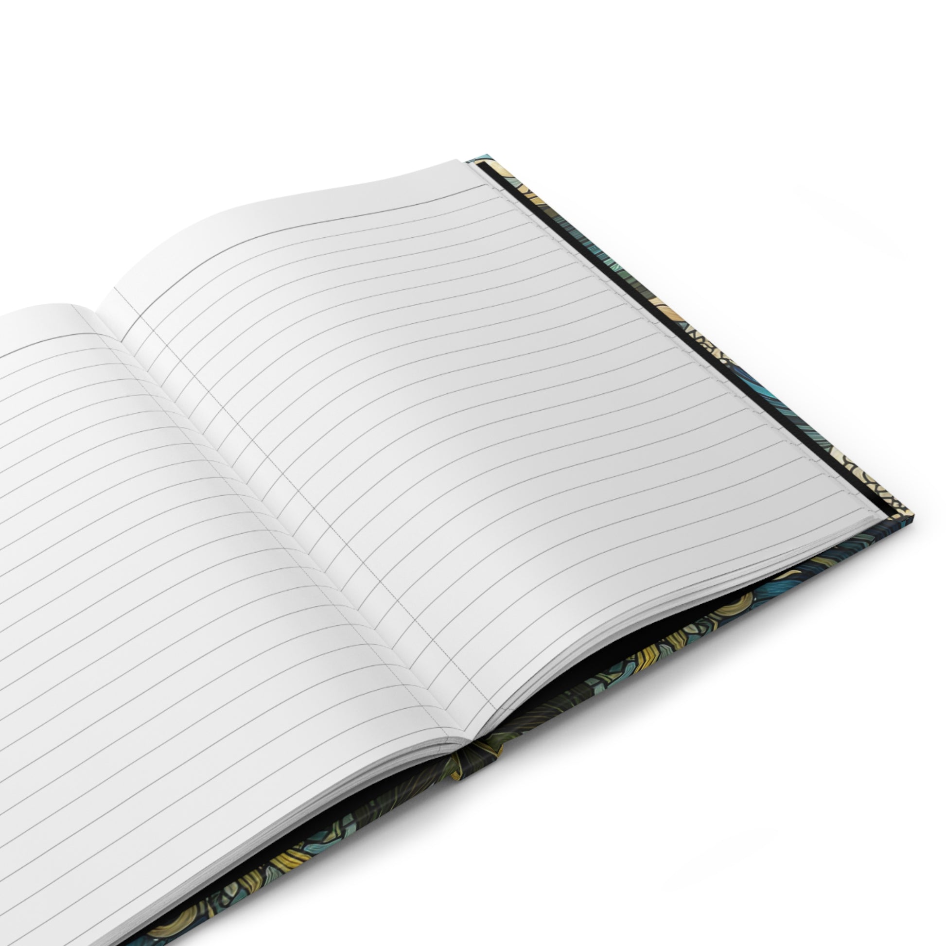 Swirling ocean with sun and sun rays stained glass artistic hard covered lined journal that gives a serene and artistic vibe. Perfect for creative souls looking for inspiration. Ideal for writers, artists, and anyone who loves to jot down their thoughts or sketches. Relevant for beach lovers, summer enthusiasts, and those who appreciate serene and beautiful designs. Great for gift giving on birthdays, holidays, and special occasions.