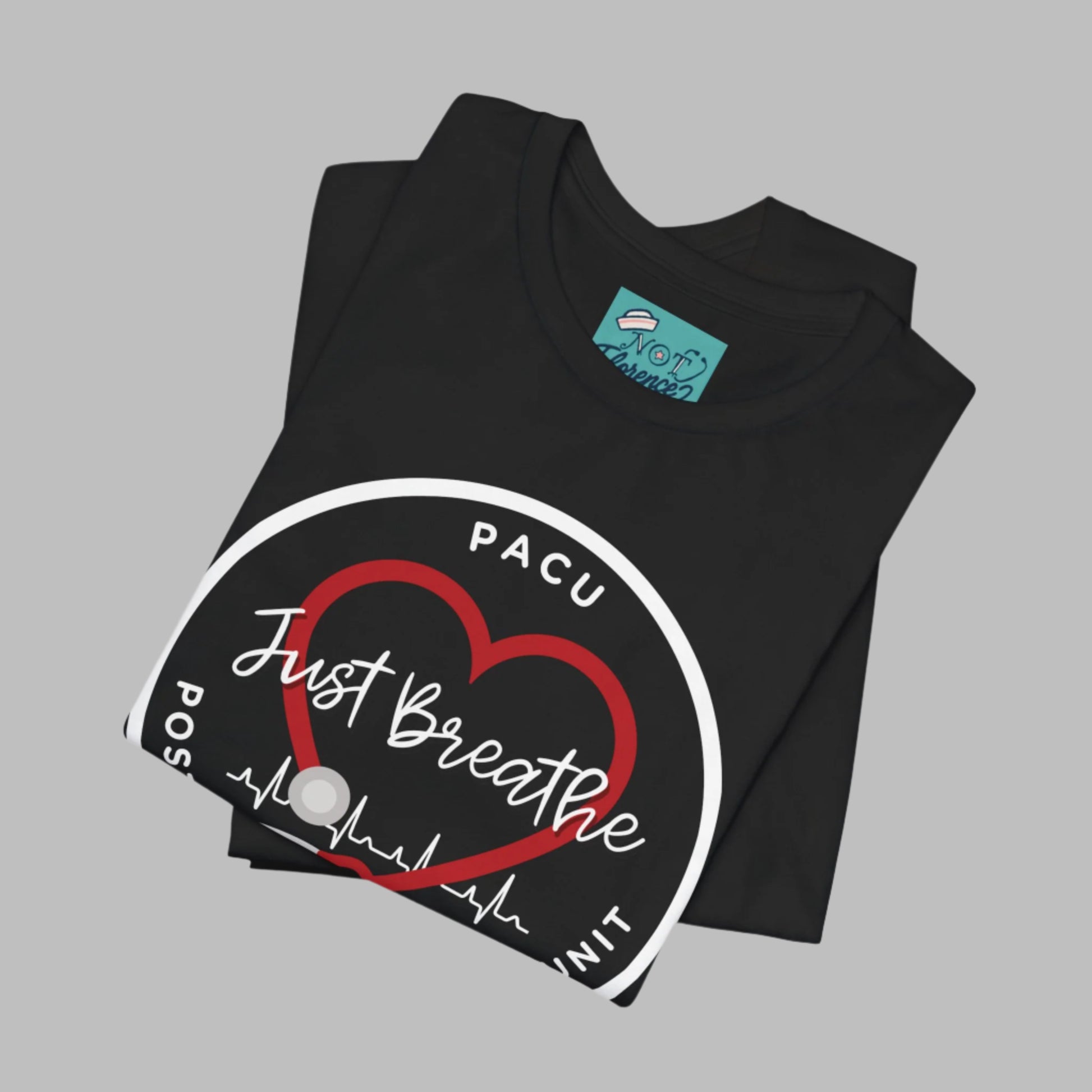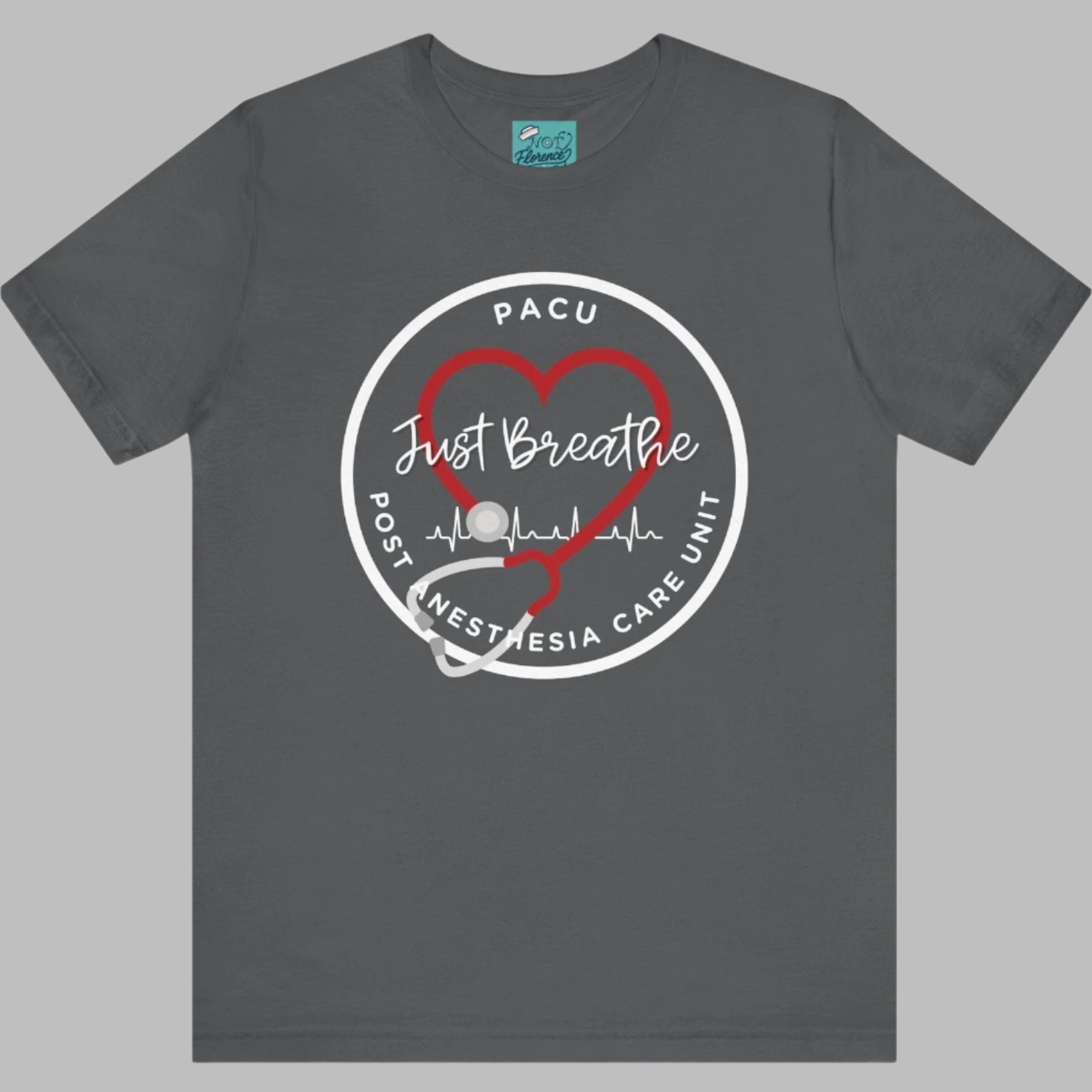 PACU team tee. “Just breathe”. Introducing the ultimate Unisex Jersey Short Sleeve Tee, designed to elevate your casual wardrobe. This tee embodies a relaxed yet stylish vibe, making it perfect for everything from laid-back weekend outings to semi-formal events. It's crafted for those who appreciate both comfort and a great fit. Ideal for anyone looking to express their personality, this shirt works well for nurses, healthcare workers, or anyone who wants to show appreciation for those in the medical field. The breathable fabric and classic crew neckline make it versatile for layering or wearing solo. A fantastic choice for holidays, appreciation days, or casual get-togethers with friends! Product features - 100% Airlume combed and ring-spun cotton for comfort - Ribbed knit collar retains its shape - Shoulder tape stabilizes seams for durability - Crisp and vibrant printing techniques for detailed designs - Tear-away label minimizes skin irritation Care instructions - Machine wash: cold (max 30C or 90F) - Non-chlorine: bleach as needed - Tumble dry: low heat - Iron, steam or dry: medium heat - Do not dryclean